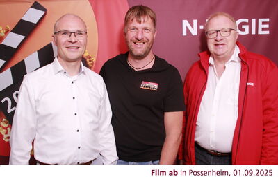 Am Montag, 01.09.2025 hieß es "Film ab". Die N-Ergie-Kinotour war mit der Komödie "Der Spitzname" zu Gast in Iphöfer Stadtteil Possenheim. Gemeinsam mit Jürgen Lang, Kommunalbetreuer der N-Ergie (rechts im Bild), freuen sich 1. Bürgermeister Dieter Lenzer (links im Bild) und Stadtrat und Stadtteilreferent Jürgen Adler, dass Possenheim Spielstätte der Jubiläumskinotour 2025 wurde. Seit 20 Jahren organisiert die N-Ergie in den Sommerferien diese Open-Air-Kino-Veranstaltungen in ausgewählten Orten des Versorgungsgebietes. Ein großes Dankeschön der Band "Friends of Nellie" für die musikalische Umrahmung sowie den örtlichen Vereinen und der Dorfgemeinschaft für ihren ehrenamtlichen Einsatz rund um die Verpflegung der zahlreichen Kinobesucher. Der Erlös kommt dem jeweiligen Veranstaltungsort zu Gute. So auch in Possenheim, wo in Kürze eine Panoramaschaukel mit herrlichem Blick auf die Possenheimer Landschaft, zum Verweilen einladen wird.