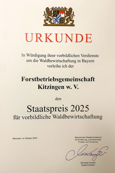 “Unter der Devise "Gemeinsam handeln" überwindet die Forstbetriebsgemeinschaft Kitzingen w.V. strukturelle Nachteile des Waldbesitzes und ermöglicht eine naturnahe und nachhaltige Waldbewirtschaftung auf großer Fläche”, so die Laudatorin bei der Preisverleihung.