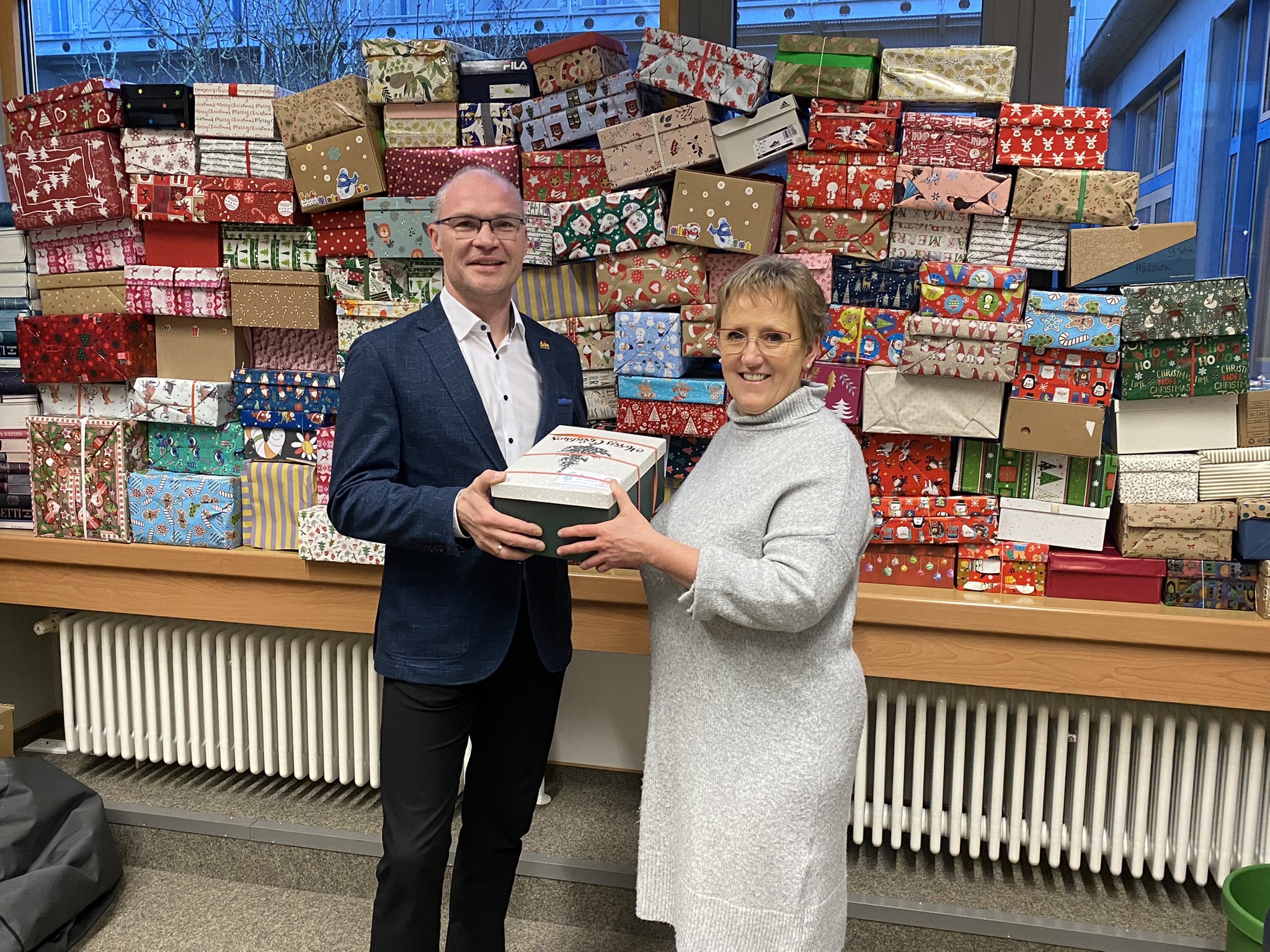 Stellvertretend für die Stadtratskandidatinnen und -kandidaten, die sich traditionell mit Päckchen und Spenden an der Aktion beteiligen, überreichte Bürgermeister Dieter Lenzer sein Geschenkpaket der Organisatorin Peggy Knauer in der Schule.